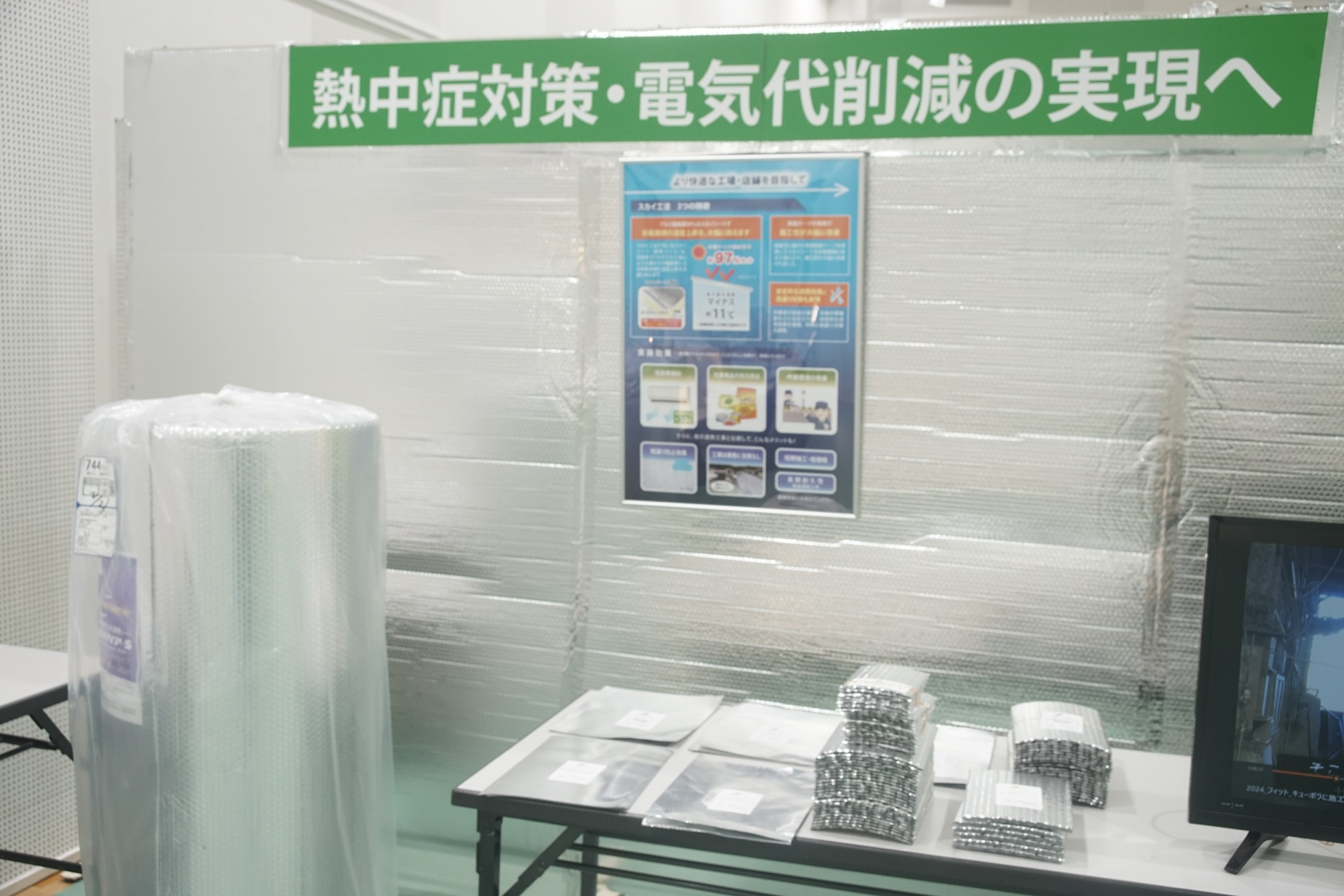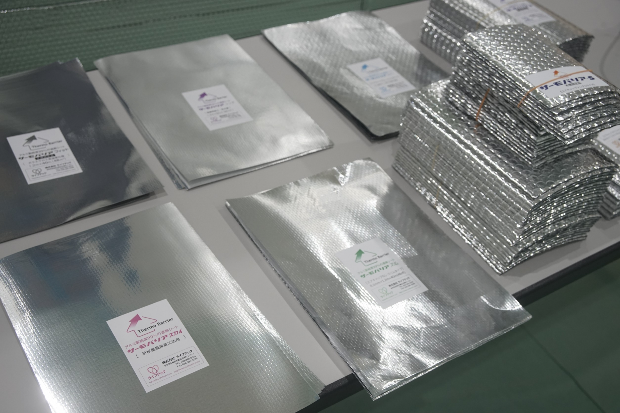 ブースには、用途に合わせた様々なタイプのサーモバリアを展示しました。気泡緩衝材をアルミ純度99%のシートで挟んだ「サーモバリアS」や、厚みのある「サーモバリアW」など、現場の状況に合わせて最適な1枚を選べるのが特徴です。また、施工に欠かせない専用のガラスクロステープやアルミテープも、高い遮熱性能を維持するための重要な役割を担っています。